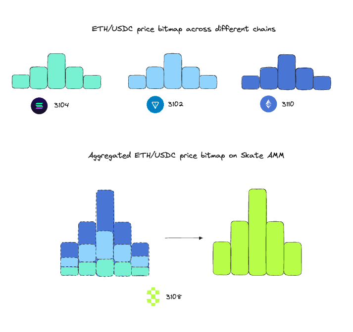 Our flagship product, Skate AMM, is a crosschain AMM designed to elevate the native user experience across chains by introducing a revolutionary pricing and liquidity model.Built on Skate’s core design principles of composability and single application state, the Skate AMM leverages an aggregated bitmap that delivers a single, unified price across all connected chains. This pricing mechanism mirrors the proven structure of a Uniswap V3 pool, yet extends beyond single-chain limitations to provide a truly cross-chain liquidity experience.